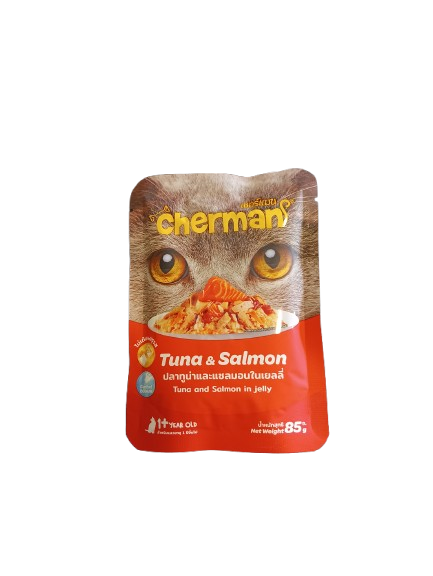 Introducing Cherman Wet Food Pouch — Tuna and Salmon in Jelly, a flavorful and nutritious wet meal with no artificial preservatives or colors, ensuring both taste and purity. Enriched nutrition, including taurine, vitamins, minerals, collagen, yeast extract, and soybean oil to support overall feline wellness—from vision and heart health to skin and coat vitality.